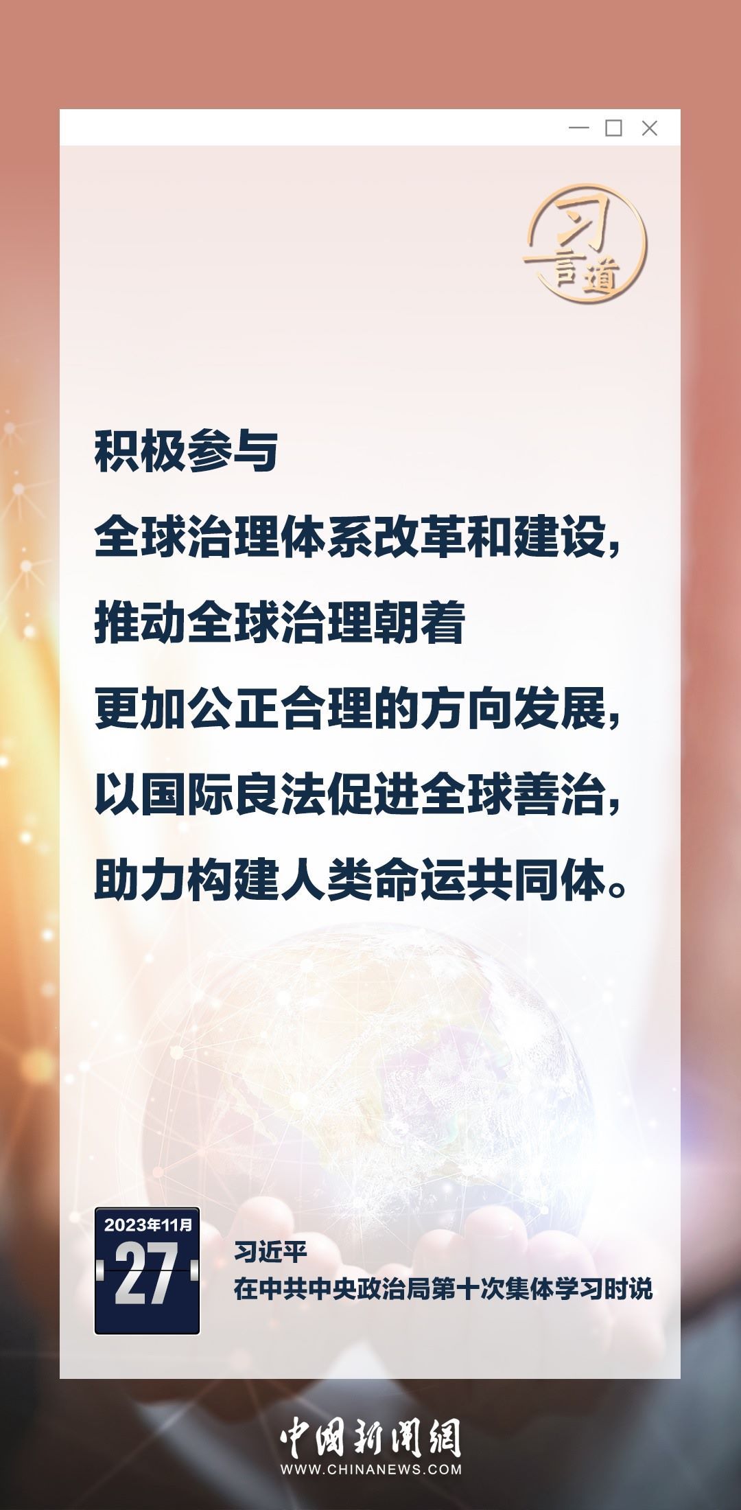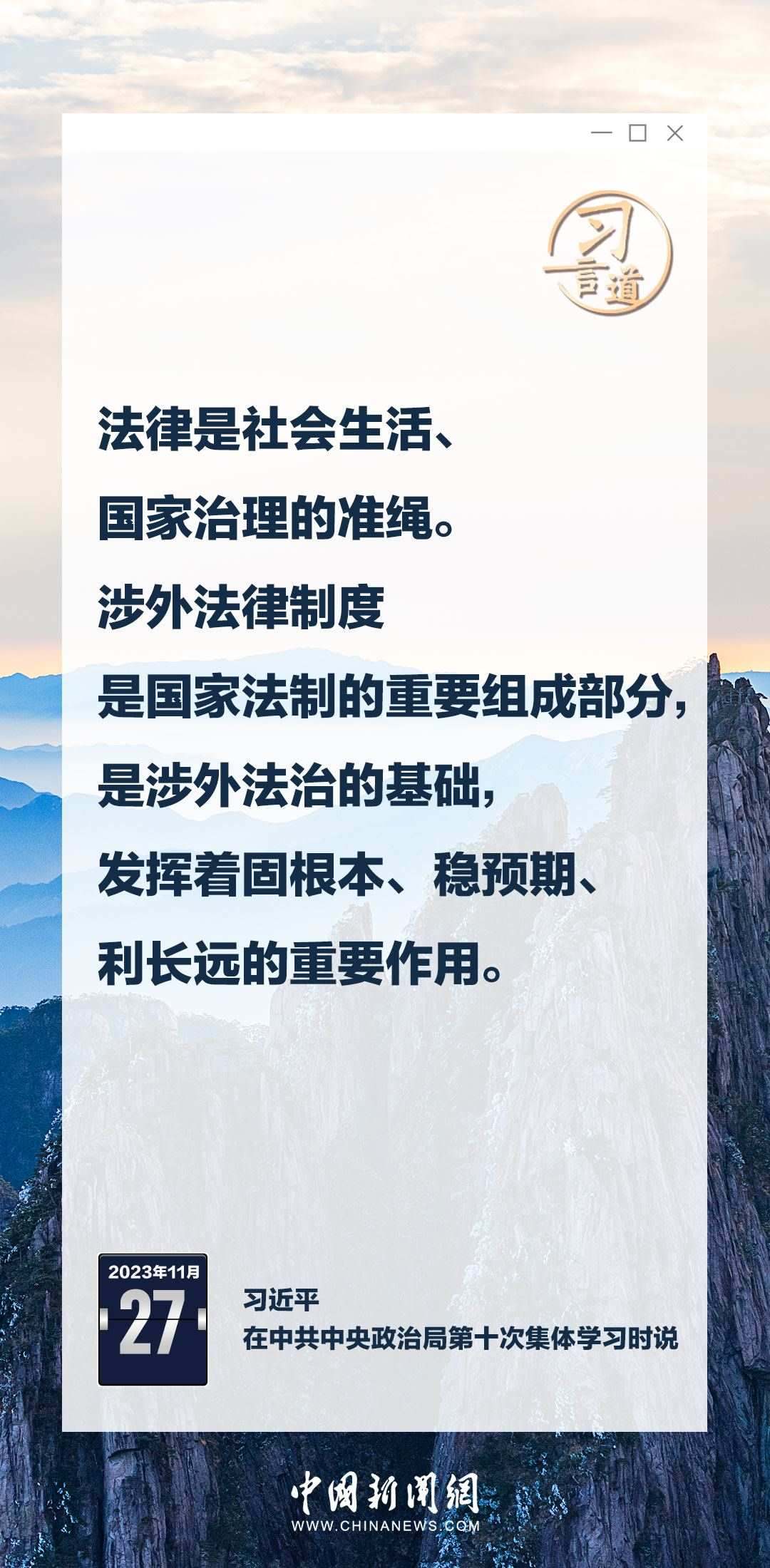 中共中央政治局11月27日下午就加強(qiáng)涉外法制建設(shè)進(jìn)行第十次集體學(xué)習(xí)。中共中央總書記習(xí)近平在主持學(xué)習(xí)時(shí)強(qiáng)調(diào)——