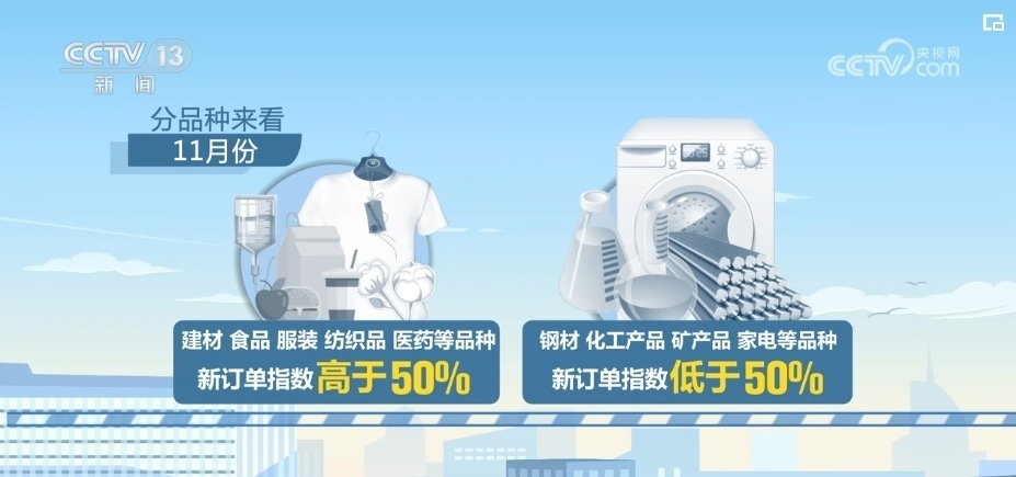 分品種來看,11月份,建材、食品、服裝、紡織品、醫(yī)藥等品種的新訂單指數高于50%。鋼材、化工產品、礦產品、家電等品種的新訂單指數低于50%。