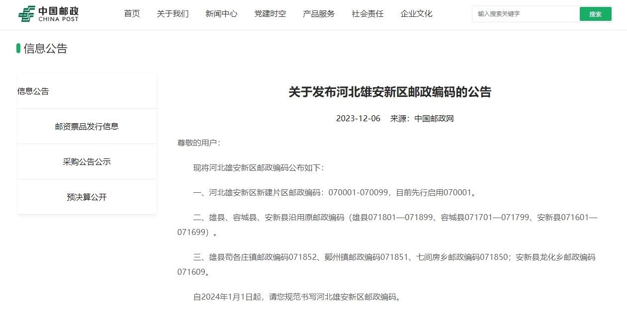 自2024年1月1日起,請您規(guī)范書寫河北雄安新區(qū)郵政編碼。