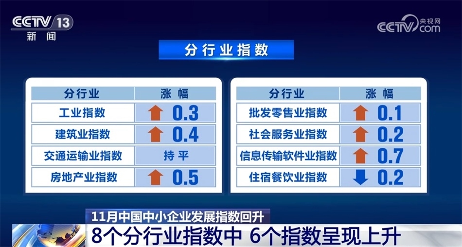 央視網(wǎng)消息:中國中小企業(yè)協(xié)會(huì)今天(12月10日)發(fā)布,11月中國中小企業(yè)發(fā)展指數(shù)上升0.2點(diǎn)。各分項(xiàng)指數(shù)均無下跌,分行業(yè)指數(shù)則是6升1平1降。