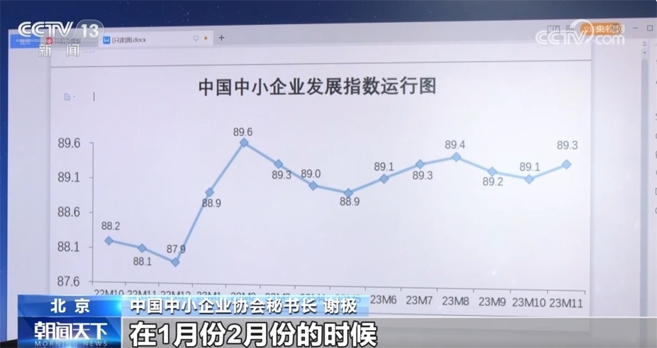 總臺(tái)央視記者 王雷:2023年的中國中小企業(yè)發(fā)展指數(shù)總體呈現(xiàn)出波浪式上升的走勢。通過對數(shù)據(jù)的分析,我們還發(fā)現(xiàn),隨著眾多中小企業(yè)加快產(chǎn)業(yè)、產(chǎn)品升級,它們的競爭力也在不斷增強(qiáng)。對比去年11月份和今年11月份的數(shù)據(jù),宏觀經(jīng)濟(jì)感受指數(shù)是分項(xiàng)指數(shù)中升幅最大的,一共上升了2.5點(diǎn)。
