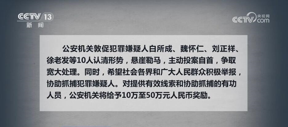 公安機關敦促犯罪嫌疑人白所成、魏懷仁、劉正祥、徐老發(fā)等10人認清形勢,懸崖勒馬,主動投案自首,爭取寬大處理。同時,希望社會各界和廣大人民群眾積極舉報,協(xié)助抓捕犯罪嫌疑人。對提供有效線索和協(xié)助抓捕的有功人員,公安機關將給予10萬至50萬元人民幣獎勵。