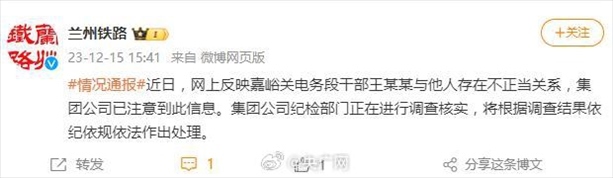 ·網(wǎng)傳國(guó)鐵蘭州局干部與女下屬存不正當(dāng)關(guān)系,官方:紀(jì)檢部門(mén)正調(diào)查核實(shí)。