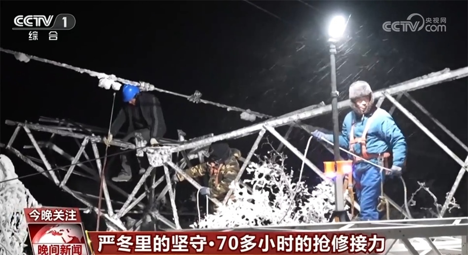 總臺(tái)記者 崔肖冉:這里的海拔超過1200米,現(xiàn)在室外氣溫降至零下20℃,感覺進(jìn)入了一個(gè)冰窖。我在室外大概走上15分鐘左右,就感覺整個(gè)關(guān)節(jié)凍得發(fā)疼,而此時(shí)此刻在距離地面大概20多米的高空,維修人員正在輸電線路上進(jìn)行緊急搶修,而且今天晚上風(fēng)很大,可想而知搶修難度有多大。