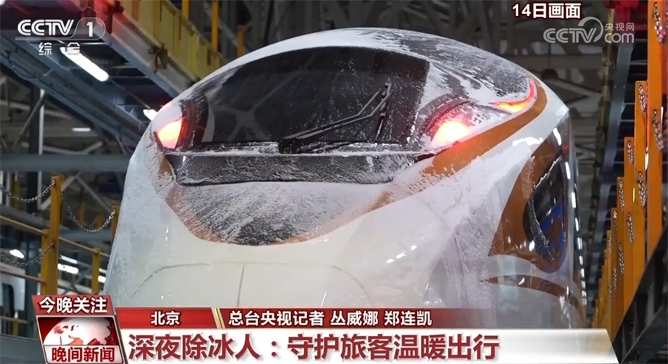 持續(xù)的雨雪冰凍天氣不僅影響公路安全,也對(duì)高鐵動(dòng)車運(yùn)行造成一定影響。晚上11點(diǎn),在北京西和雄安站間運(yùn)行一天的C2727次列車完成任務(wù),入庫檢修,車頭上頂著厚厚的冰塊。