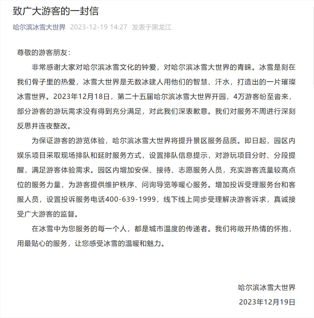 ·哈爾濱冰雪大世界開園首日被喊退票,園區(qū)發(fā)文致歉:連夜整改。當(dāng)?shù)匚穆镁只貞?yīng)已去現(xiàn)場督導(dǎo)。