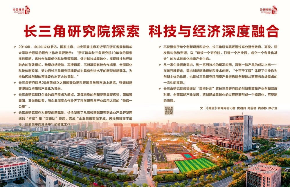 ◇2014年,中共中央總書記、國家主席、中央軍委主席習近平在浙江省委和清華大學聯合報送的報告上作出重要批示:“浙江清華長三角研究院10年來的探索實踐說明,省校合作是優(yōu)化科技資源配置、促進科技成果轉化、實現科技與經濟融合的有效模式。希望總結經驗,再接再厲,不斷鞏固省校合作成果,全面深化科技體制改革,努力把長三角研究院建設成為具有先進水平的新型創(chuàng)新載體,為推動區(qū)域創(chuàng)新體系建設作出更大的貢獻?!?/strong>
