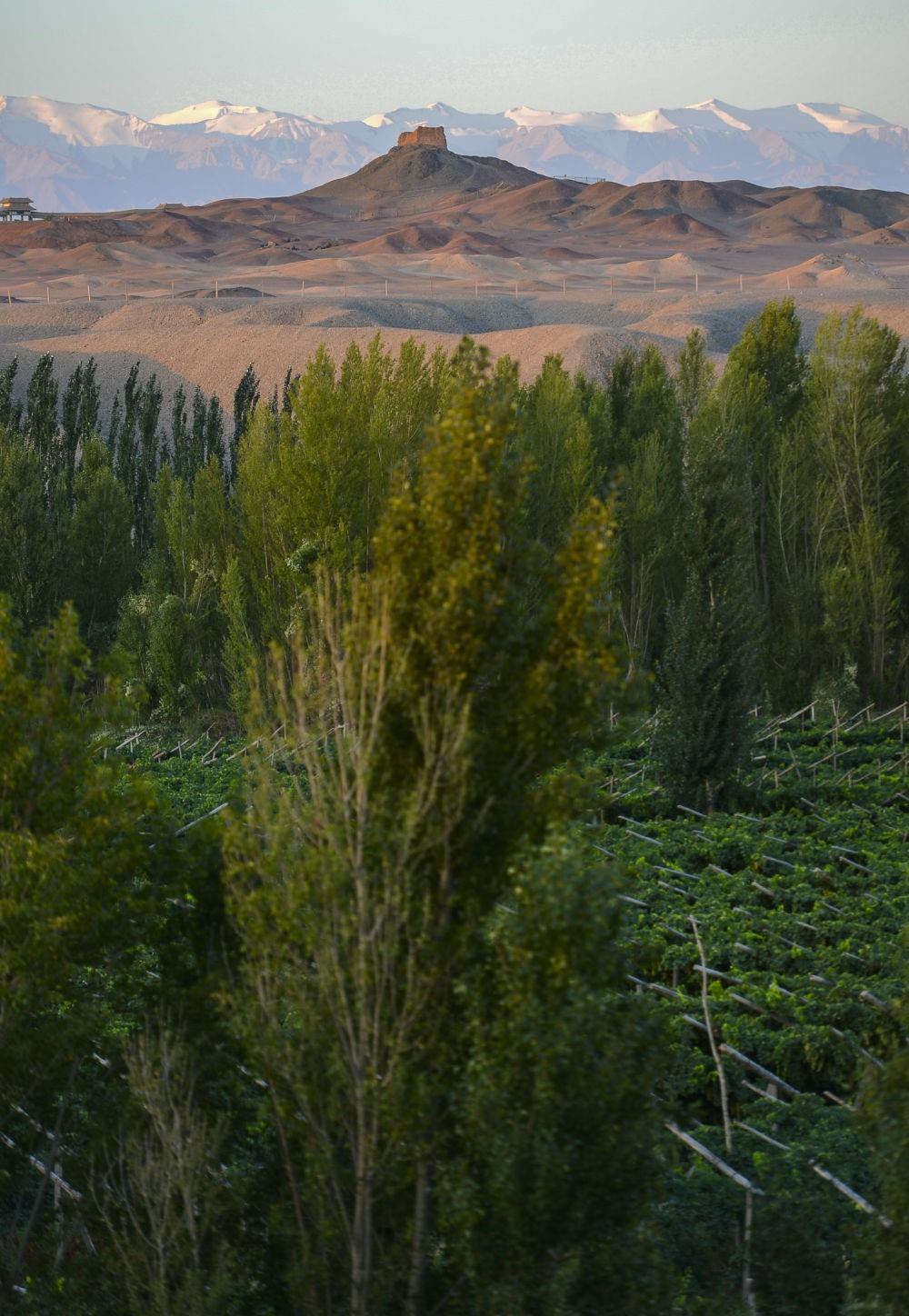 甘肅省敦煌市陽(yáng)關(guān)遺址前的綠洲(2013年9月5日攝)。