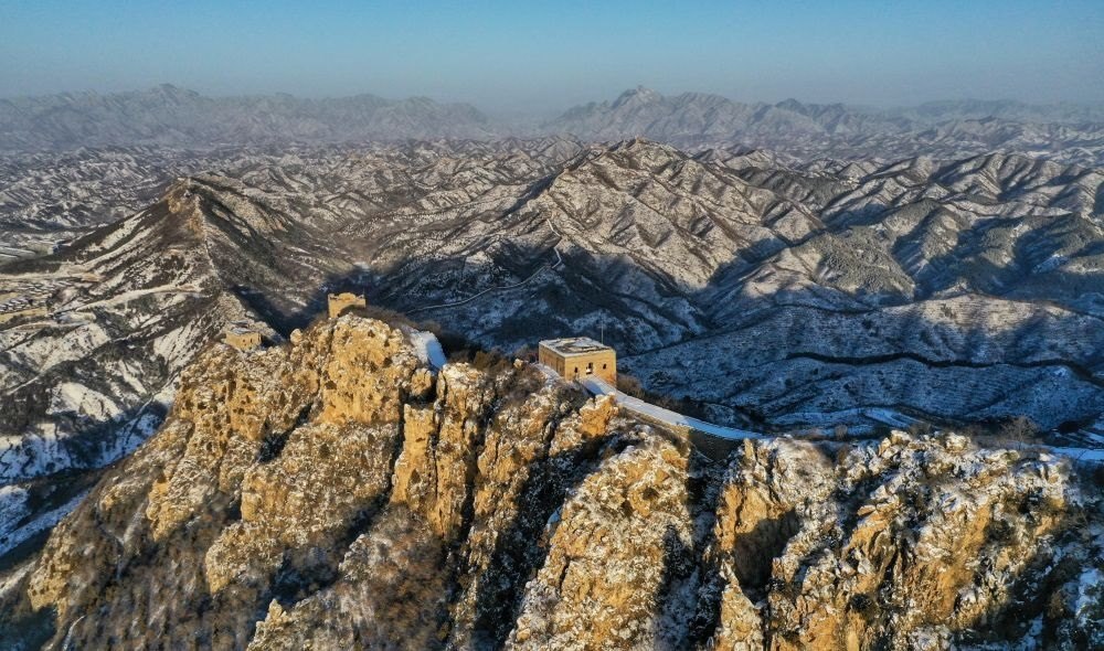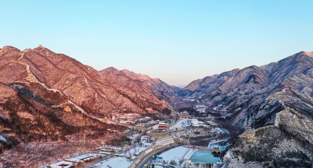 朝陽(yáng)灑在雪后的居庸關(guān)長(zhǎng)城上(無人機(jī)照片,2023年12月16日攝)。