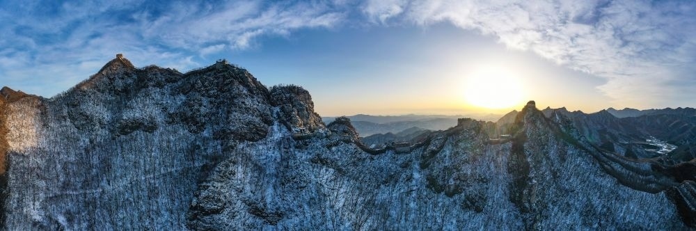 夕陽(yáng)下的北京箭扣長(zhǎng)城(無人機(jī)全景照片,2023年2月13日攝)。