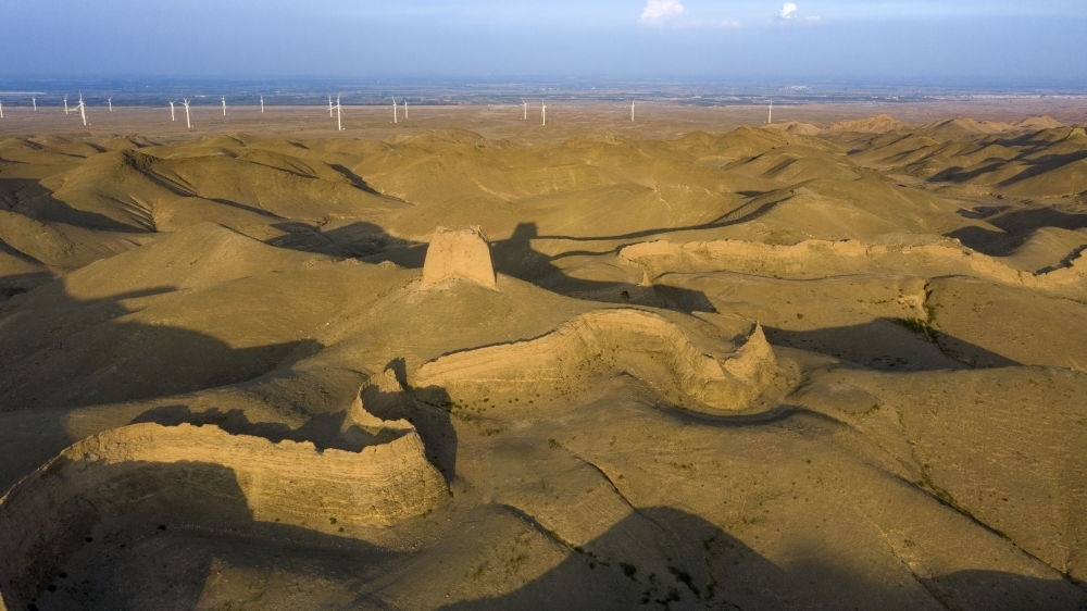 這是位于寧夏銀川市境內(nèi)的三關(guān)口土夯明長(zhǎng)城(無人機(jī)照片,2021年8月13日攝)。