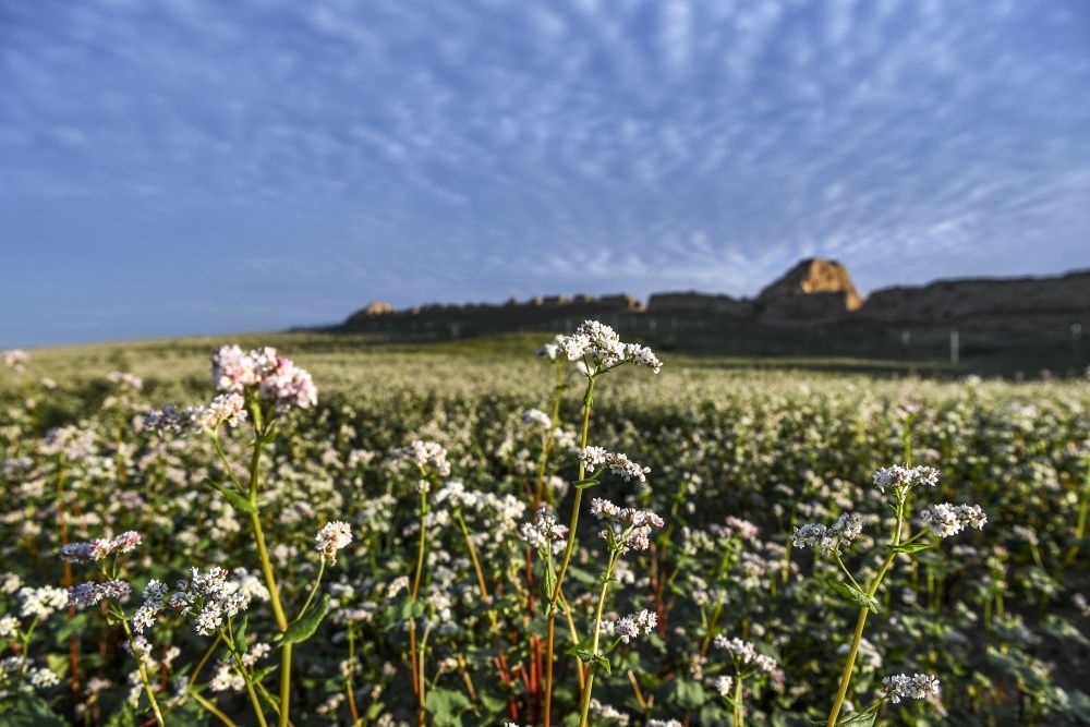 寧夏吳忠市鹽池縣一處長(zhǎng)城腳下蕎麥花開放(2023年8月18日攝)。