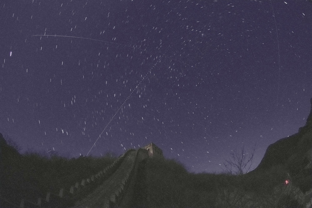 在北京延慶水關(guān)長(zhǎng)城拍攝的中國(guó)空間站過境照片(從左下向右上的軌跡為中國(guó)空間站,軌跡為多張照片堆棧,2021年12月12日攝)。