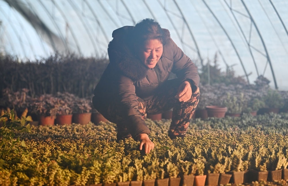 在天津市北辰區(qū)雙口鎮(zhèn)中河頭村,農戶正查看大棚里的多肉植物。新華社記者 李然 攝