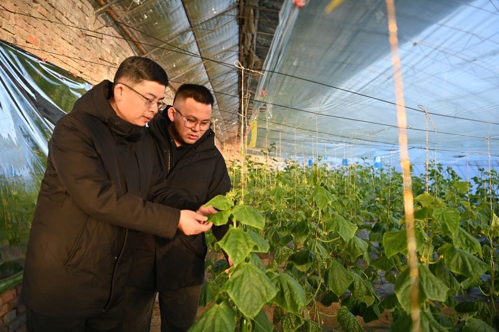 在天津市北辰區(qū)雙口鎮(zhèn)中河頭村,程相博(左一)與村干部正查看蔬菜種植情況。新華社記者 李然 攝
