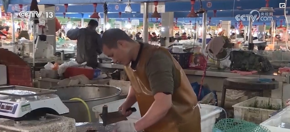 隨著節(jié)日臨近,市場里海鮮的需求量也在不斷增加。一天下來,海鮮攤主們的手要反復(fù)浸泡在冷水里,顧客越多、生意越好,意味著手在冷水里浸泡的時(shí)間就越長。盡管如此,攤主們?yōu)轭櫩吞幚砗ur的動(dòng)作依舊麻利。
