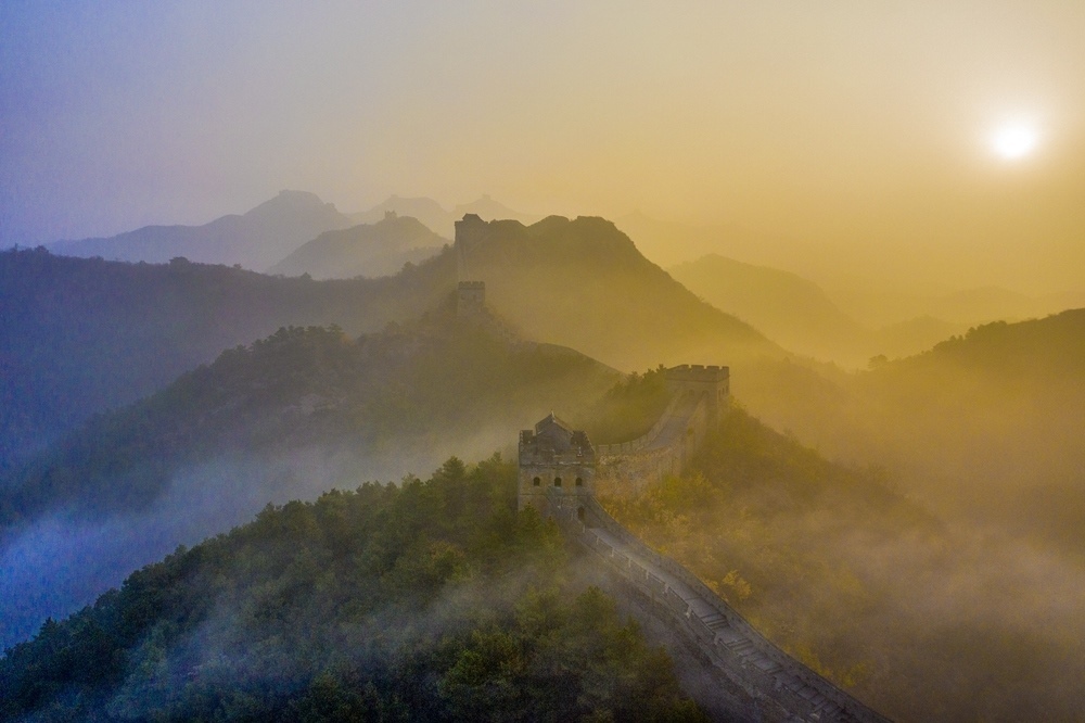 這是2023年11月1日拍攝的河北承德金山嶺長(zhǎng)城日出景觀(無人機(jī)照片)。新華社發(fā)(周萬平 攝)