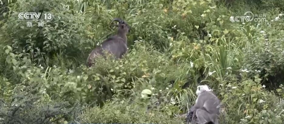 突然,林間騷動(dòng)起來(lái),幾只長(zhǎng)尾葉猴從天而降來(lái)到塔爾羊中間,這是首次記錄到這兩個(gè)物種群體同框覓食的珍貴畫(huà)面。對(duì)它們而言,聚在一起可以加強(qiáng)警戒,更容易發(fā)現(xiàn)天敵。