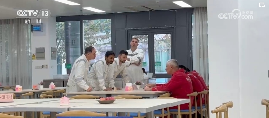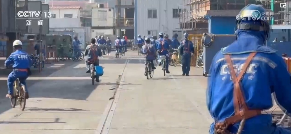 一輛輛各式各樣的自行車平穩(wěn)穿梭在安全區(qū),車上的工友有事兒就會互相召喚,拿出圖紙解決問題,互通有無。而在職工和船東餐廳里,一張張餐桌上分區(qū)標(biāo)記了各個業(yè)主單位。吃完飯撤掉餐具,大家就開始“頭腦風(fēng)暴”,現(xiàn)場辦公。