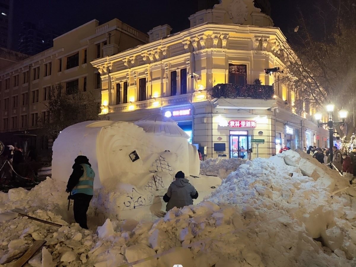 元旦假期的中央大街,鄂倫春族人牽馴鹿巡游,馬迭爾冰棍攤位前排起了隊(duì),天南海北的游客在這里感受寒冷徹骨與熱氣騰騰的交織。55歲的臧洪洲,正與其他幾位雕刻師傅一起打磨一座名叫“五谷豐登 年年有魚”的雪雕作品,夜幕降臨,留給他們的時間不多了。