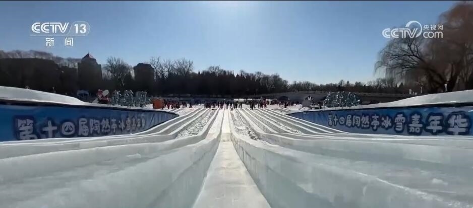 總臺(tái)記者 袁嘉憶:這里是陶然亭公園冰雪嘉年華的現(xiàn)場(chǎng),我手邊的這個(gè)設(shè)施就是北京核心區(qū)規(guī)模最大的冰滑梯。我們可以看到這個(gè)冰滑梯有10條滑道,每一條滑道都有120多米長(zhǎng),而且上下具有5米高的落差。體驗(yàn)起來(lái)會(huì)是什么樣?來(lái),跟我走。