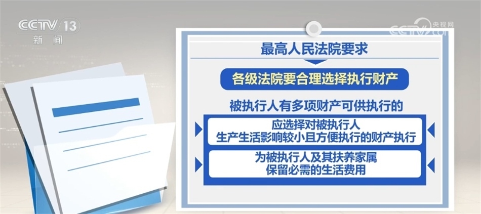 最高人民法院要求,各級法院要合理選擇執(zhí)行財(cái)產(chǎn),被執(zhí)行人有多項(xiàng)財(cái)產(chǎn)可供執(zhí)行的,應(yīng)選擇對被執(zhí)行人生產(chǎn)生活影響較小且方便執(zhí)行的財(cái)產(chǎn)執(zhí)行,同時,為被執(zhí)行人及其扶養(yǎng)家屬保留必需的生活費(fèi)用。對涉及企業(yè)尤其是民營企業(yè)的,要嚴(yán)格區(qū)分企業(yè)法人財(cái)產(chǎn)與股東個人財(cái)產(chǎn),嚴(yán)禁違法查封案外人財(cái)產(chǎn),嚴(yán)禁對不得查封的財(cái)產(chǎn)采取執(zhí)行措施,堅(jiān)決杜絕超標(biāo)的查封,切實(shí)保護(hù)民營企業(yè)等企業(yè)法人、企業(yè)家和各類市場主體合法權(quán)益。