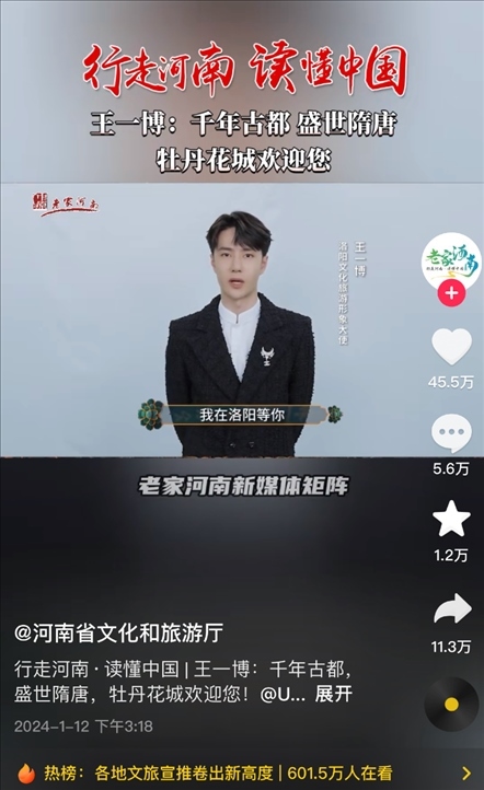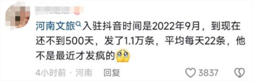 有人統(tǒng)計(jì),自1月9日起,河南文旅官方賬號“河南省文化和旅游廳”每天發(fā)布二三十條視頻,連續(xù)四天發(fā)布了112條視頻,持續(xù)展示本地文旅資源,吸引了近百萬新粉絲,主打一個(gè)“量變總會(huì)引起質(zhì)變”,以至于“河南文旅到底發(fā)了多少抖音”相關(guān)話題成為熱門搜索。
