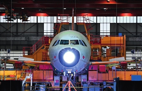 空客天津總裝線(xiàn)的首架空客A321飛機(jī)上線(xiàn)總裝(2022年11月9日攝) 趙子碩攝/本刊