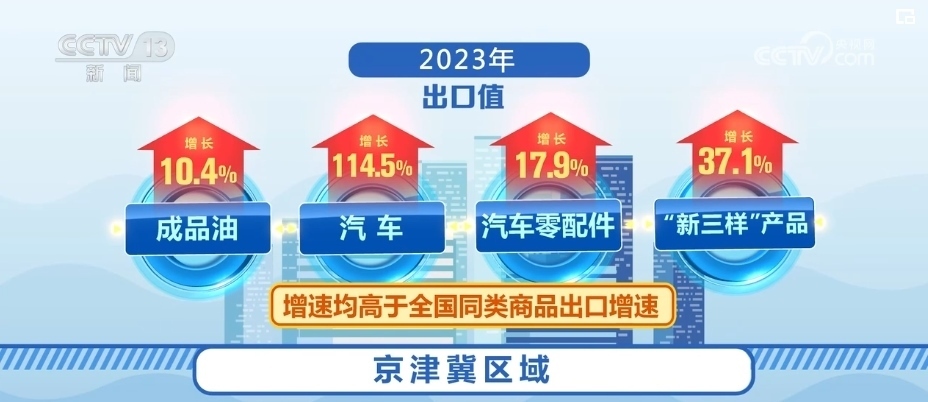 出口方面,2023年京津冀區(qū)域出口1.31萬億元,增長(zhǎng)2.5%,占全國(guó)出口總值的5.5%。其中,成品油、汽車、汽車零配件、“新三樣”產(chǎn)品出口值分別增長(zhǎng)10.4%、114.5%、17.9%、37.1%,增速均高于全國(guó)同類商品出口增速。成品油出口量、出口值占全國(guó)成品油出口總量、出口總值的一半以上。