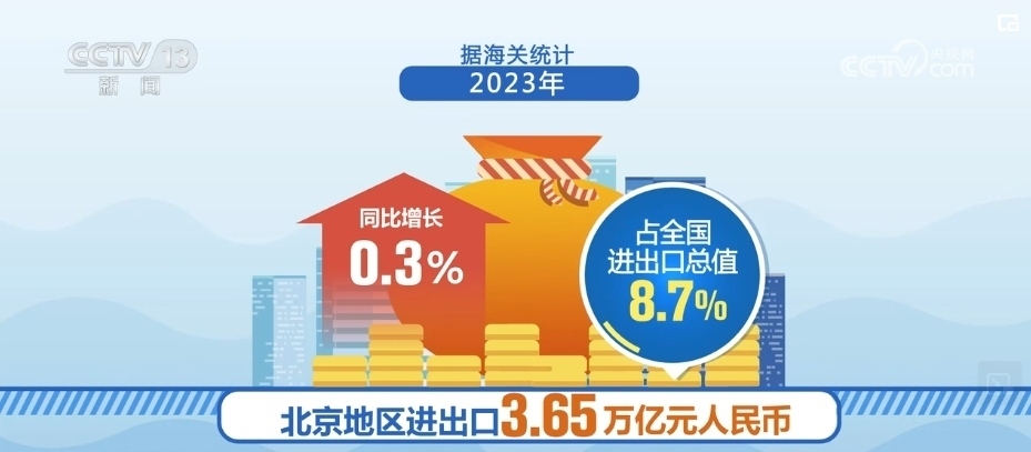 據(jù)海關(guān)統(tǒng)計(jì),2023年,北京地區(qū)進(jìn)出口3.65萬億元人民幣,同比增長(zhǎng)0.3%,占全國(guó)進(jìn)出口總值的8.7%。