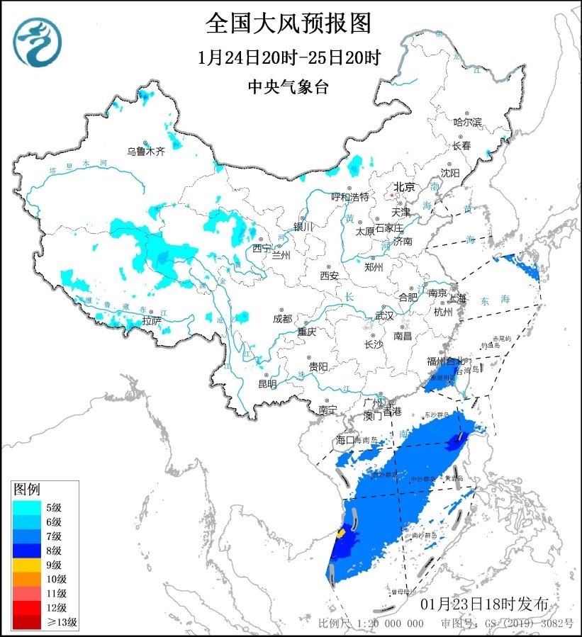 1月24日20時(shí)至25日20時(shí),青海北部和西部、福建沿海等地部分地區(qū)有5~6級(jí)、陣風(fēng)7級(jí)的大風(fēng);臺(tái)灣海峽、巴士海峽、南海大部海域?qū)⒂?~8級(jí)、陣風(fēng)9~10級(jí)的大風(fēng),其中南海西南部的部分海域風(fēng)力可達(dá)9級(jí)、陣風(fēng)10級(jí)。