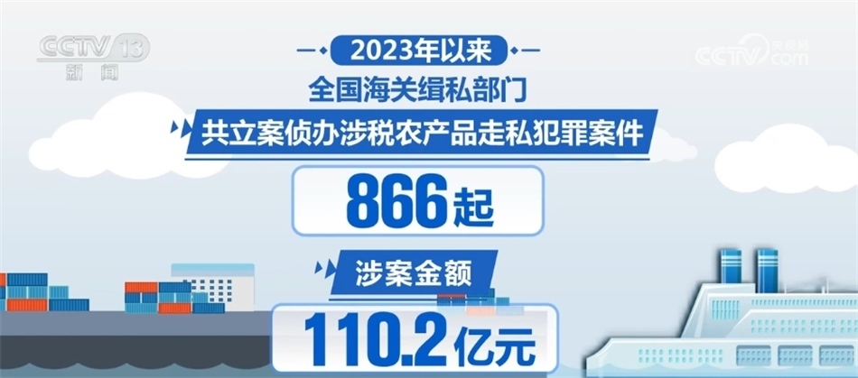 針對(duì)農(nóng)產(chǎn)品走私問題,海關(guān)緝私部門加大打擊凍品、煙草、水果、食糖、糧食等農(nóng)產(chǎn)品走私力度,推動(dòng)強(qiáng)化對(duì)運(yùn)輸、倉(cāng)儲(chǔ)、銷售環(huán)節(jié)的清查整治。2023年以來,共立案?jìng)赊k涉稅農(nóng)產(chǎn)品走私犯罪案件866起,涉案金額110.2億元。