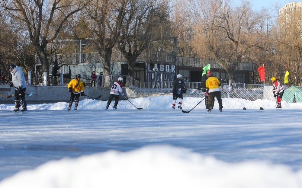 ?2024年1月7日,冰球愛好者在遼寧省沈陽(yáng)市勞動(dòng)公園人工湖上打冰球。新華社記者 陳為 攝