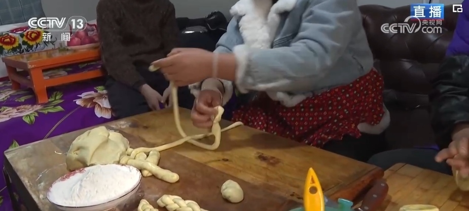 炸年饃是當(dāng)?shù)赝磷迦罕娪哟汗?jié)的傳統(tǒng)習(xí)俗。一家人齊上陣,這邊兩位大姐正在將發(fā)好的面揉好、揪出面劑子、搟成圓形、表面抹上清油,放進(jìn)油鍋里炸熟。對于土族群眾來說,進(jìn)入臘月之后就開始做年饃、宰年豬、置辦年貨,年味兒就濃了。炸年饃是當(dāng)?shù)厝罕娖碓感碌囊荒觑L(fēng)調(diào)雨順、五谷豐登、平安順?biāo)斓拿篮迷⒁?。制作年饃的面粉、菜籽油等材料都是政府給受災(zāi)群眾提供的物資。