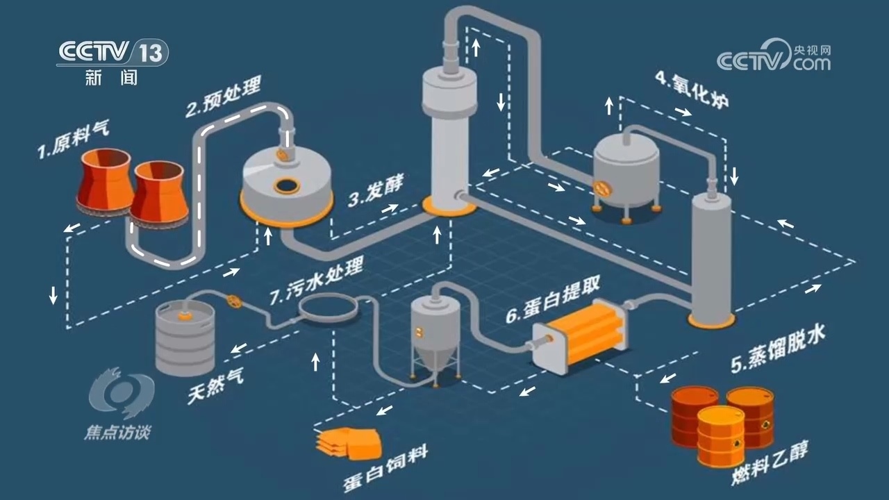 河北首朗新能源科技有限公司副總經(jīng)理?xiàng)钇G:“首先工業(yè)尾氣通過管道輸送到氣體預(yù)處理工段,經(jīng)過簡(jiǎn)單的壓縮和煤氣凈化,由管道輸送到核心發(fā)酵工段,氣體從發(fā)酵罐的底部進(jìn)入到頂部,單程只有幾十秒的時(shí)間。”