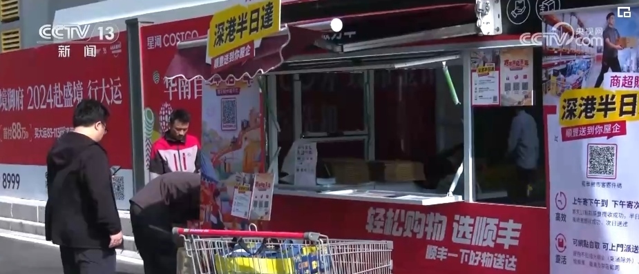 在深圳的這家超市,從出口處向外走兩步,就是快遞公司專門在現(xiàn)場設置的寄送服務點。大包、小包的商品從剛剛推出的購物車里被陸續(xù)裝進打包箱,即發(fā)即走。港澳消費者大概前腳剛到家,后腳就能收到貨。