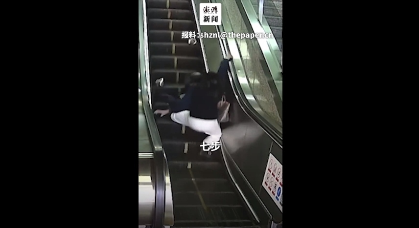 ·江蘇南京地鐵站內(nèi)一老人在乘坐扶梯時(shí)突然失去平衡,向后倒去,身后女子用七步護(hù)住老人。
