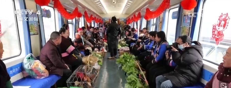 在貴州,有一趟往返于貴陽與玉屏之間的“慢火車”5640次列車,里面專設(shè)了一個農(nóng)特產(chǎn)品車廂。新春臨近,村民們將自家養(yǎng)殖的土雞、雞蛋,熏制的香腸、臘肉,以及水果、蔬菜帶上列車,向旅客現(xiàn)場售賣。