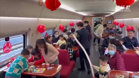·今年春運期間,自廈門始發(fā)開往北京、上海、南京等方向的部分16節(jié)車廂“長編組”高鐵列車開設(shè)了“遛娃艙”,供帶娃家庭使用。