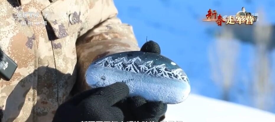 新疆軍區(qū)紅山嘴邊防連 段昱恒:我畫的這塊石頭,這里是我們紅山嘴邊防連的一個(gè)哨樓,這里是我們一起來(lái)的6名新兵,從哨樓出來(lái)準(zhǔn)備去巡邏,前方有冰河,有雪山。在這里我還畫了一條龍,新的一年是龍年,我也希望大家龍馬精神,見(jiàn)龍皆是福。