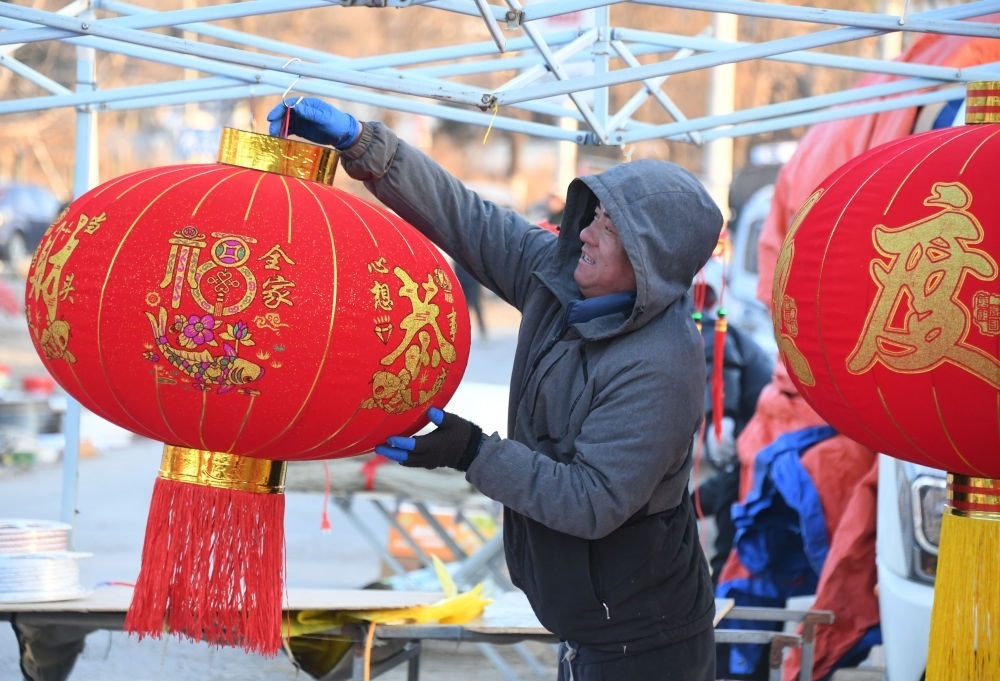 2024年1月27日,在北京市平谷區(qū)金海湖鎮(zhèn)靠山集大集,商戶在布置攤位。新華社記者 任超 攝