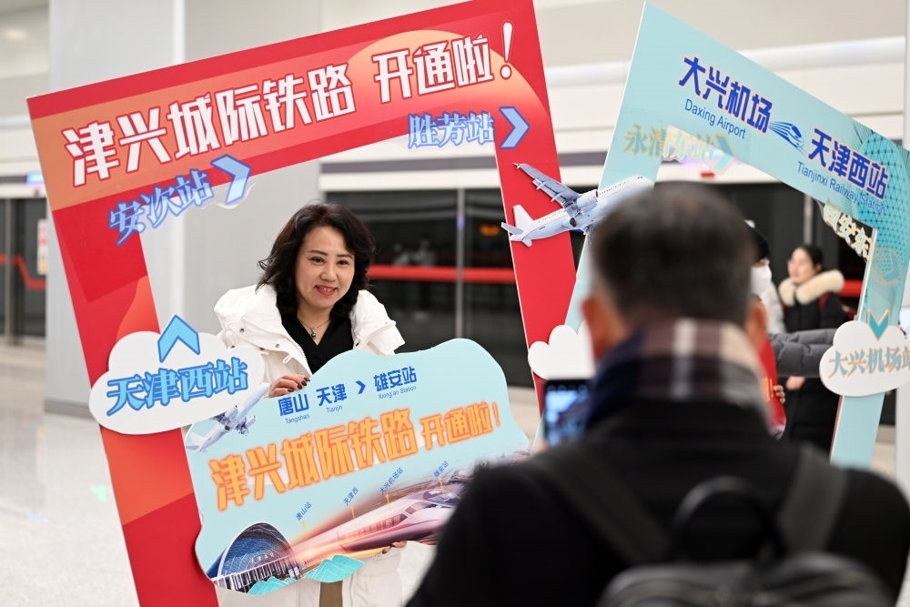 2023年12月18日,旅客在大興機場站拍照留念。當(dāng)日,津興城際鐵路正式開通運營。新華社記者 李然 攝
