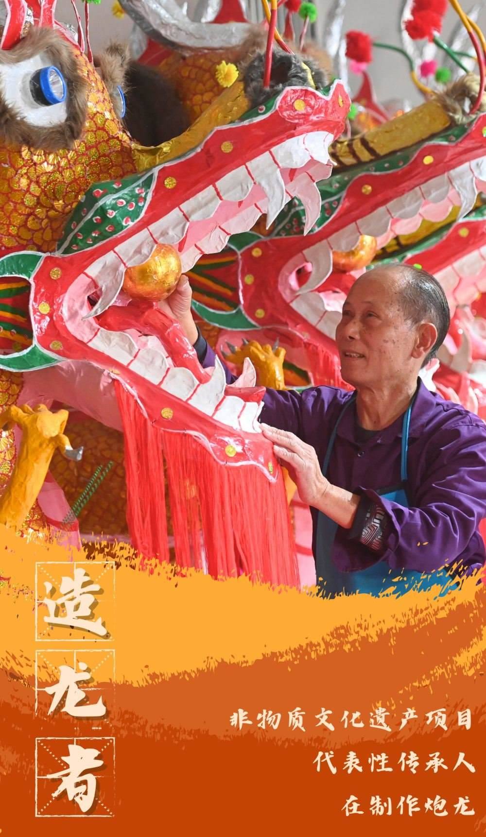 用竹篾扎制龍頭、龍尾,用砂紙裝裱,麻繩串聯(lián)龍身,用龍布裝飾,僅龍頭就有1000多個捆綁點,一條炮龍需多人合制半個月才能完成……造龍,需要非凡的耐心和超群的手藝。