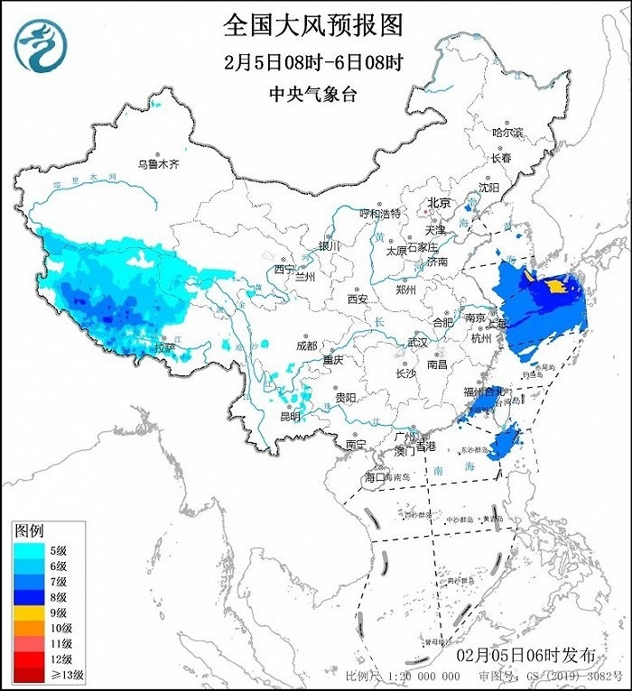 預(yù)計,2月5日08時至6日08時,西藏中西部、青海西南部等地將有5~7級、陣風(fēng)8級的大風(fēng);黃海南部海域、東海大部海域、臺灣海峽、巴士海峽將有7~8級、陣風(fēng)9級的大風(fēng),其中黃海東南部、東海東北部的部分海域風(fēng)力可達(dá)9級、陣風(fēng)10級。