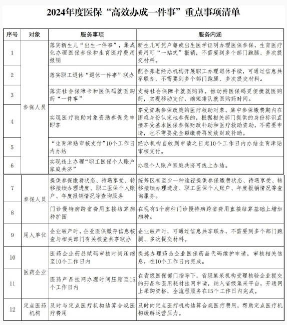 為貫徹落實《國務院關(guān)于進一步優(yōu)化政務服務提升行政效能推動“高效辦成一件事”的指導意見》(國發(fā)〔2024〕3號,下文簡稱《指導意見》),精細化科學化常態(tài)化優(yōu)化醫(yī)保服務,提高群眾、企業(yè)和醫(yī)藥機構(gòu)獲得感,國家醫(yī)療保障局今天(2月9日)發(fā)布關(guān)于在醫(yī)療保障服務領(lǐng)域推動“高效辦成一件事”的通知,著力提供更加便捷高效的醫(yī)療保障服務。