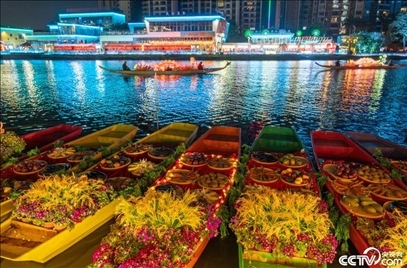 2月5日,廣東佛山,春節(jié)臨近,佛山最大的水上花市在里水鎮(zhèn)開幕。其中水上渡船、水上燈會等項目融入了非遺元素,展示嶺南水鄉(xiāng)風(fēng)情,營造濃濃的年味。