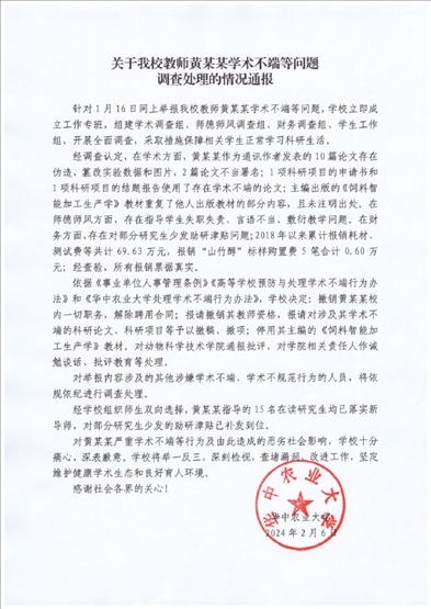 ·華中農(nóng)業(yè)大學(xué)通報教師黃某某學(xué)術(shù)不端等問題:撤職、解聘,其指導(dǎo)的15名研究生均已落實新導(dǎo)師。