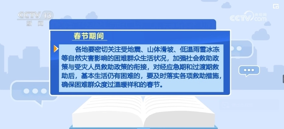 各地要密切關(guān)注受地震、山體滑坡、低溫雨雪冰凍等自然災(zāi)害影響的困難群眾生活狀況,加強(qiáng)社會(huì)救助政策與受災(zāi)人員救助政策的銜接,對(duì)經(jīng)應(yīng)急期和過渡期救助后,基本生活仍有困難的,要及時(shí)落實(shí)各項(xiàng)救助措施,確保困難群眾度過溫暖祥和的春節(jié)。