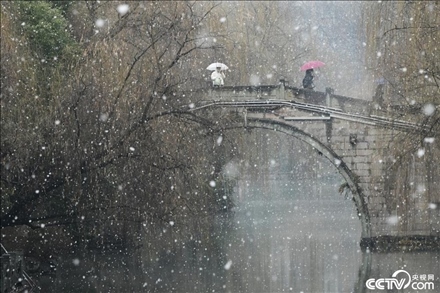杭州漫天飛雪,市民橋頭賞雪。
