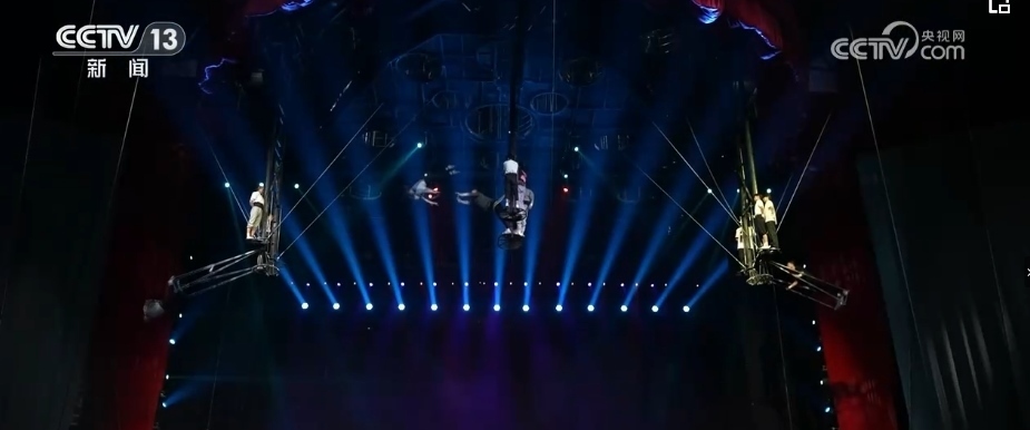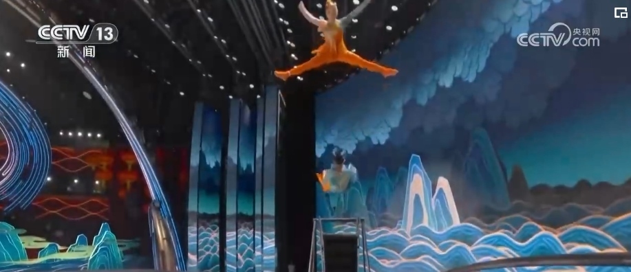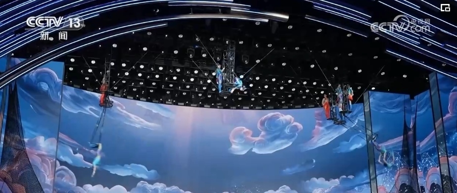 40多年來(lái),春晚劇組首次在1號(hào)廳高空安裝飛人裝置,道具和技巧以及創(chuàng)意的融合,完美演繹了傳說(shuō)中的魚(yú)躍龍門。
